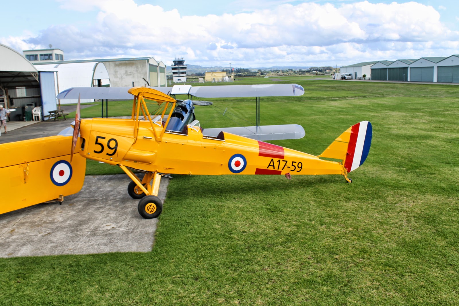 Languishing in Aero Pacific Coatings hangar since 2005 at Tauranga,the owner Kim Thomson has finally finished a long term restoration project of a former 1940 R,A,A,F DH82A Tiger Moth A17-59 which was written off in 1940 and used as a Christmas tree to keep other Tigers flying during training of pilots in Australia at Tamworth.